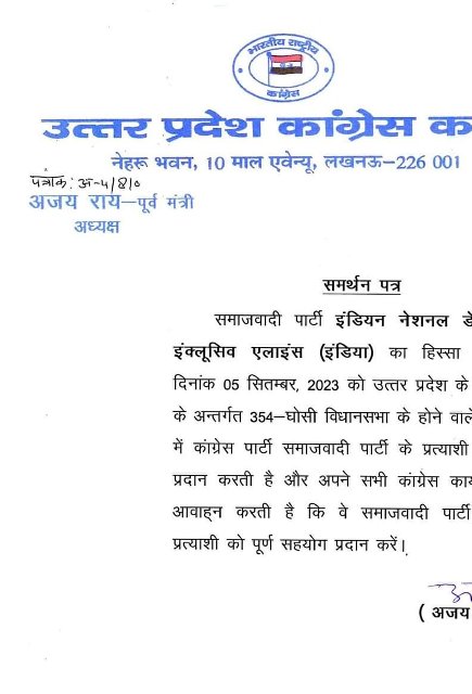 प्रदेश अध्यक्ष अजय राय ने पत्र जारी कर कहा कि वर्तमान समय में इंडियन नेशनल डेवलपमेंटल इंक्लूसीव एलाइंस अर्थात ‘इंडिया’ की समाजवादी पार्टी हिस्सेदार है। मऊ जनपद के अंतर्गत घोसी विधानसभा में हो रहे उपचुनाव में कांग्रेस अपना समर्थन समाजवादी पार्टी को प्रदान करती है। कांग्रेस के कार्यकर्ताओं से आह्वाहन है, वे समाजवादी पार्टी के उम्मीदवार को पूर्ण सहयोग प्रदान करें।