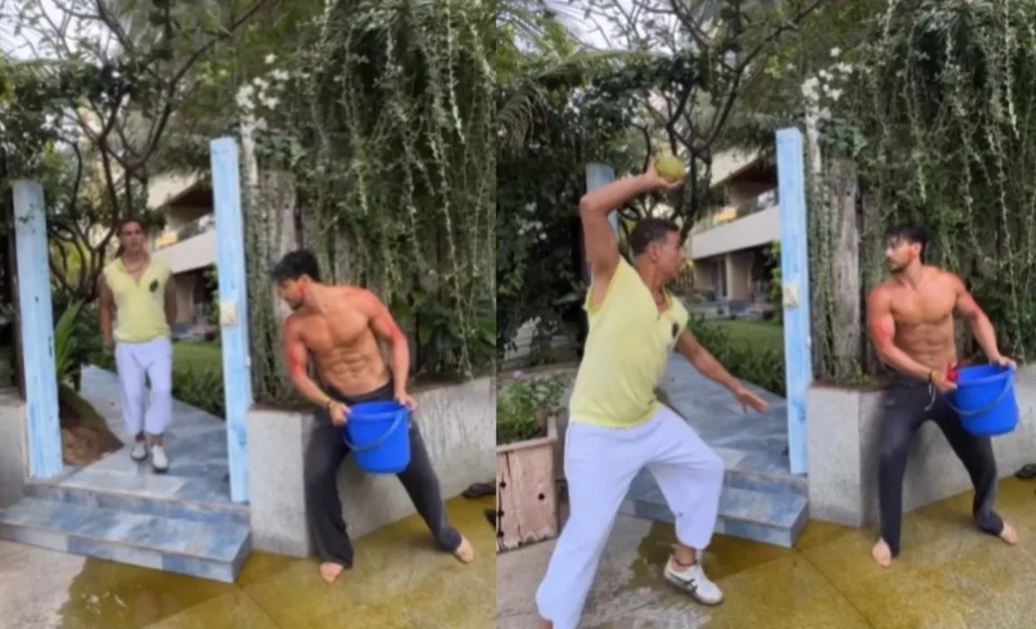 सोशल मीडिया पर वायरल हो रहे वीडियो में अक्षय कुमार अपने बंगले से बाहर निकलते नजर आ रहे हैं। तभी बंगले के बाहर रंगीन पानी से भरी बाल्टी लेकर खड़े टाइगर श्रॉफ आते हैं और पानी से भरी पूरी बाल्टी अक्षय कुमार के शरीर पर डालने वाले होते हैं, तभी अक्षय अपने हाथ में लिया नारियल उनकी तरफ फेंकने का इशारा करते हैं, जिसे देखकर टाइगर डर जाते हैं और अपने ऊपर पानी की बाल्टी उड़ेल लेते हैं। ये मजेदार वीडियो आपको भी मुस्कुराने पर मजबूर कर देगा। अक्षय और टाइगर का यह वीडियो इस वक्त सोशल मीडिया पर खूब चर्चा में है।