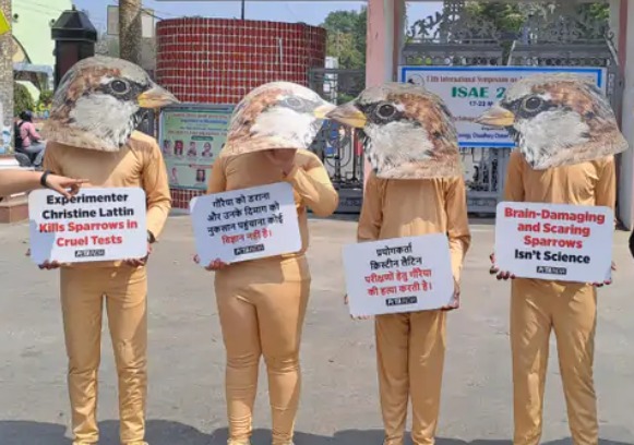 पीपल फॉर द एथिकल ट्रीटमेंट ऑफ एनिमल्स (पेटा) इंडिया के कार्यकर्ताओं ने मंगलवार को विशाल गौरैया के मुखौटे पहन कर और हाथों में प्रोटेक्शन पोस्टर लेकर चौधरी चरण सिंह विश्वविद्यालय के मुख्य द्वार पर प्रदर्शन किया। उन्होंने अंतरराष्ट्रीय संगोष्ठी में आई अमेरिका की लंइसियाना स्टेट यूनिवर्सिटी की वैज्ञानिक डॉ. क्रिस्टीन आर लैटिन पर क्रूरता का आरोप लगाते हुए जमकर प्रदर्शन किया। उन्होंने कहा कि क्रूर क्रिस्टीन लैटिन ने अपने परीक्षणों में गौरैया को मार डाला है। गौरैया के दिमाग को नुकसान पहुंचाना और डराना कोई विज्ञान नहीं है। उन्होंने विश्वविद्यालय में डॉ. क्रिस्टीन आर लैटिन के व्याख्यान का विरोध किया। कार्यकर्ताओं ने कहा कि चिड़ियों पर क्रूर और निराधार परीक्षण करना क्रूरता है। वे अपने बेतुके प्रयोगों से चिड़ियों को यातनाएं देती हैं। जैसी उन्हें ट्रांसमीटर लगाना, इंजेक्ट करना, अनजानी वस्तुएं दिखाना, उनके सिर काट देना। इन भीषण व क्रूर प्रयोगों में ही उन्हें मार देना शामिल है।