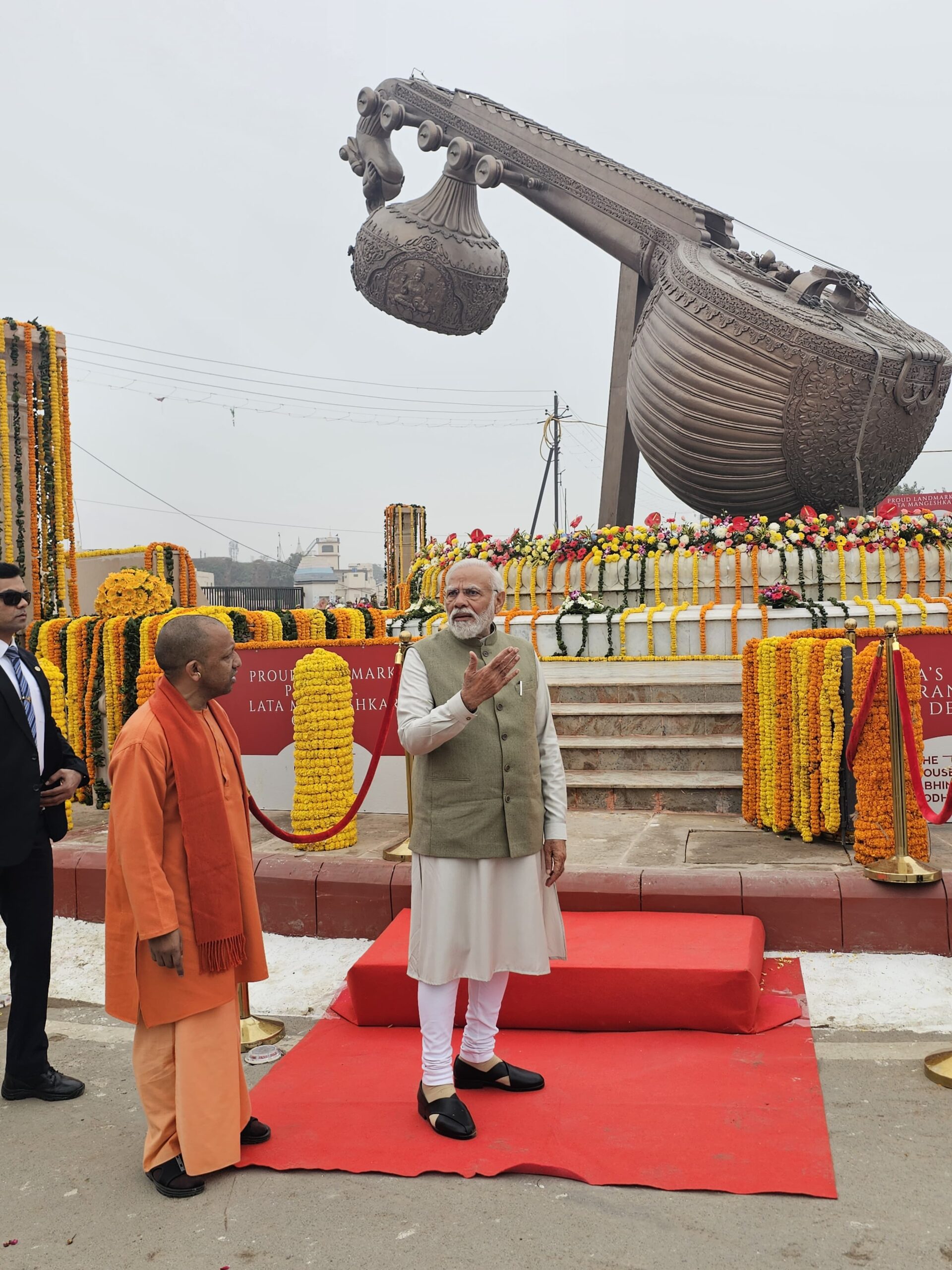 अयोध्या (हि.स.)। अयोध्या धाम रेलवे स्टेशन के लोकार्पण के बाद एयरपोर्ट लौटते समय प्रधानमंत्री नरेन्द्र मोदी लता मंगेशकर चौक गए। पिछले वर्ष लता मंगेशकर की जयंती पर 28 सितंबर को उन्होंने इसका वर्चुअली उद्घाटन किया गया था। चौक पर 14 टन वजनी एवं 40 फुट लंबी वीणा लगाई गई है। प्रधानमंत्री मोदी शनिवार को पहली बार वीणा के पास पहुंचकर भाव-विभोर हो गए। उन्होंने वीणा की अलौकिक छवि का दीदार किया। प्रधानमंत्री ने मुख्यमंत्री से इसकी विस्तृत जानकारी भी ली। उन्होंने अयोध्या के समूचे जनमानस का यहीं से अभिवादन किया। प्रधानमंत्री को यहां देख जनता भी अभिभूत हो गई। यहां सुर साम्राज्ञी लता मंगेशकर के सुरों में श्रीराम के भजन भी गूंज रहे थे।