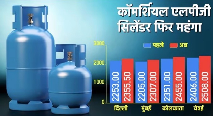नई दिल्ली। देश में महंगाई से परेशान लोगों को एक और झटका लगा है। दरअसल, कॉमर्शियल एलपीजी सिलेंडर की कीमतों में आज यानी एक मई से 100 रुपये से अधिक का इजाफा हो गया है। हालांकि घरेलू एलपीजी सिलेंडर के उपभोक्ताओं को अभी राहत मिली हुई है। बता दें कि पिछले महीने यानी एक अप्रैल को कॉमर्शियल एलपीजी सिलेंडर की कीमतों में 250 रुपये का इजाफा हुआ था। इंडियन ऑयल कॉर्पोरेशन के अनुसार दिल्ली के लोगों को आज से 19 किलोग्राम के एलपीजी सिलेंडर के लिए 2355.50 रुपये भुगतान करने होंगे। इससे पहले 2253 रुपये ही लगते थे। वहीं, कोलकाता में इसकी कीमत 2351 रुपये से बढ़कर 2455 रुपये हो गई है। मुंबई में 2205 रुपये की जगह 2307 रुपये अब खर्च करने होंगे। तमिलनाडु की राजधानी चेन्नई में कॉमर्शियल सिलेंडर की कीमतें बढ़कर 2406 रुपये की जगह 2508 रुपये हो गई हैं। वहीं, राष्ट्रीय राजधानी दिल्ली में बिना सब्सिडी वाले 14.2 किलोग्राम वाले घरेलू गैस सिलेंडर की कीमत 949.5 रुपये है। इसके अलावा कोलकाता में घरेलू रसोई गैस सिलेंडर की कीमत 976 रुपये, मुंबई में 949.50 रुपये और चेन्नई में बिना सब्सिडी वाले सिलेंडर की कीमत अब 965.50 रुपये है। वहीं, लखनऊ में घरेलू रसोई गैस की कीमत 987.50 रुपये है, जबकि पटना में 14.2 किलो के रसोई गैस सिलेंडर की कीमत 1039.5 रुपये है। क्या है कमर्शियल गैस सिलेंडर की नई कीमत आज से यानी एक मई से कमर्शियल गैस सिलेंडर महंगा हो गया।