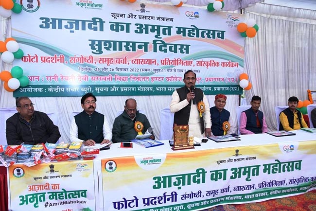 केन्द्रीय संचार ब्यूरो, सूचना और प्रसारण मंत्रालय, भारत सरकार प्रयागराज द्वारा संचालित तीन दिवसीय आजादी का अमृत महोत्सव और सुशासन दिवस प्रचार अभियान व चित्र प्रदर्शनी में विद्यालय प्रबन्ध समिति के सचिव और हंडिया पी.जी.कालेज के पूर्व प्राचार्य डॉ रघुराज प्रताप सिंह ने कहा कि लोकतांत्रिक मूल्यों को मजबूत करने के लिए छात्र-छात्राओं को स्वतंत्रता संग्राम के इतिहास की जानकारी होनी चाहिए।