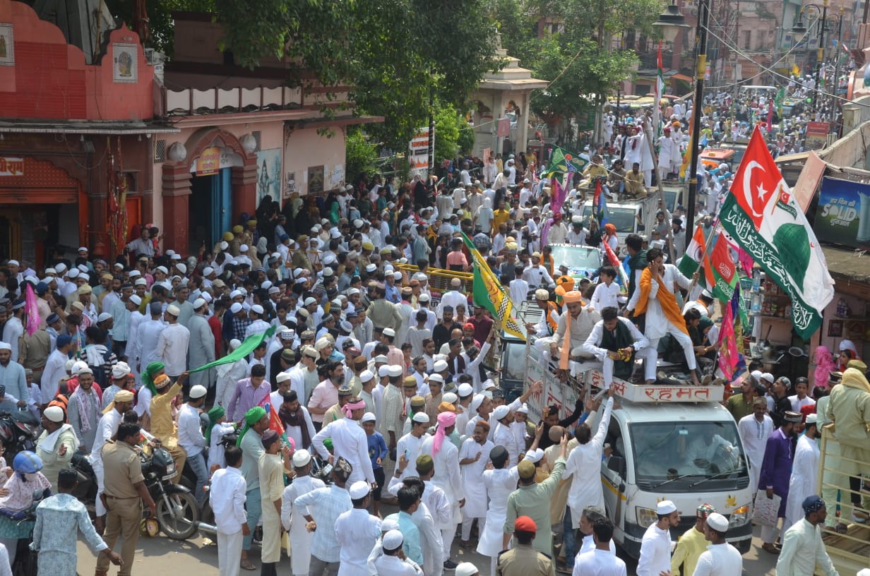 वाराणसी (हि.स.)। पैगंबर-ए-इस्लाम हजरत मोहम्मद (स.) की यौमे पैदाइश पर गुरूवार को धर्म नगरी काशी में मजहबी जोश, आपसी सद्भाव के साथ देश प्रेम का अद्भुत जज्बा देखने को मिला। ईद मिलादुन्नबी पर मरकजी दावते इस्लामी जुलूसे मुहम्मदी कमेटी एवं मुफ्ती बोर्ड के सदर और जनरल सेकेटरी की निगरानी में रेवड़ी तालाब मैदान से सुबह पूरे शान के साथ जुलूस-ए-मोहम्मदी निकाला गया। इसमें शामिल होने के लिए मुस्लिम समुदाय के बड़े-बुर्जुगों के साथ युवाओं और बच्चों का रेला उमड़ पड़ा। सिर पर हरा साफा बांध लकदक कपड़ों में सजे लोग एक हाथ में मजहबी परचम तो दूसरे हाथ में तिरंगा थाम इसे लहराते हुए जुलूस में शामिल हुए।
