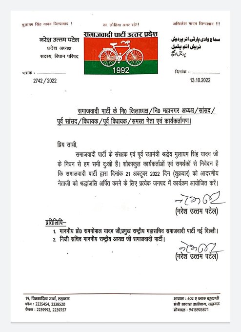 लखनऊ (हि.स.)। समाजवादी पार्टी के संस्थापक दिवंगत मुलायम सिंह यादव को आगामी 21 अक्टूबर को उत्तर प्रदेश के प्रत्येक जिले में श्रद्धांजलि दी जाएगी। प्रदेश अध्यक्ष नरेश उत्तम ने इसके लिए पार्टी की सभी जिला एवं महानगर इकाई के अध्यक्षों, प्रमुख पदाधिकारियों, सांसद, विधायक समेत सभी जनप्रतिनिधियों को पत्र जारी किया है।