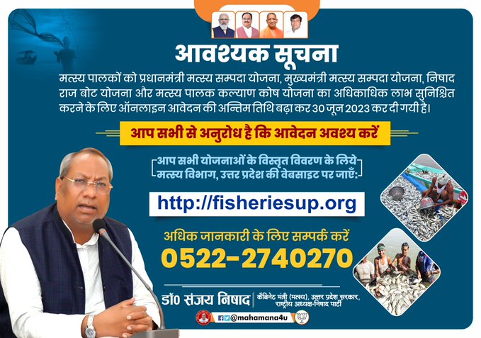 डॉ. संजय निषाद ने अपने आधिकारिक ट्विटर अकाउंट से ट्वीट कर बताया कि मत्स्य पालकों को प्रधानमंत्री मत्स्य सम्पदा योजना, मुख्यमंत्री मत्स्य सम्पदा योजना, निषाद राज बोट योजना और मत्स्य पालक कल्याण कोष योजना का अधिकाधिक लाभ सुनिश्चित करने के लिए ऑनलाइन आवेदन की अन्तिम तिथि बढ़ा दिया गया है। अब 30 जून 2023 इन योजनाओं के लिए आवेदन किया जा सकता है।
