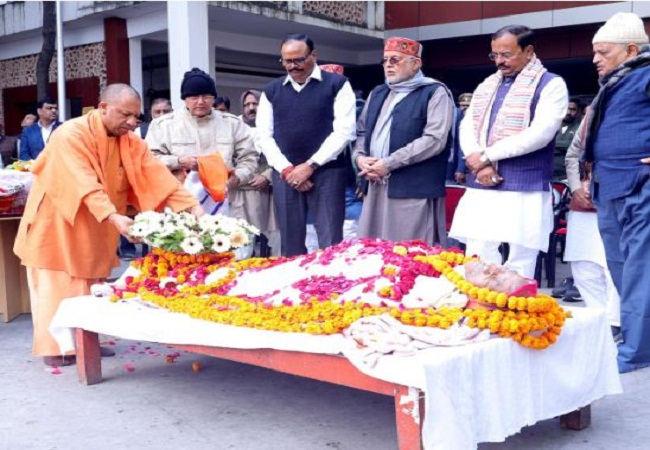 लखनऊ(हि.स.)। उत्तर प्रदेश के मुख्यमंत्री योगी आदित्यनाथ, केन्द्रीय राज्यमंत्री कौशल किशोर व उप मुख्यमंत्री केशव प्रसाद मौर्य समेत भाजपा के कई वरिष्ठ नेताओं ने मंगलवार को भाजपा प्रदेश कार्यालय पर पहुंचकर किसान मोर्चा के संगठक रहे हृदयनाथ सिंह के पार्थिव शरीर पर पुष्पांजलि अर्पित कर श्रद्धांजलि दी।