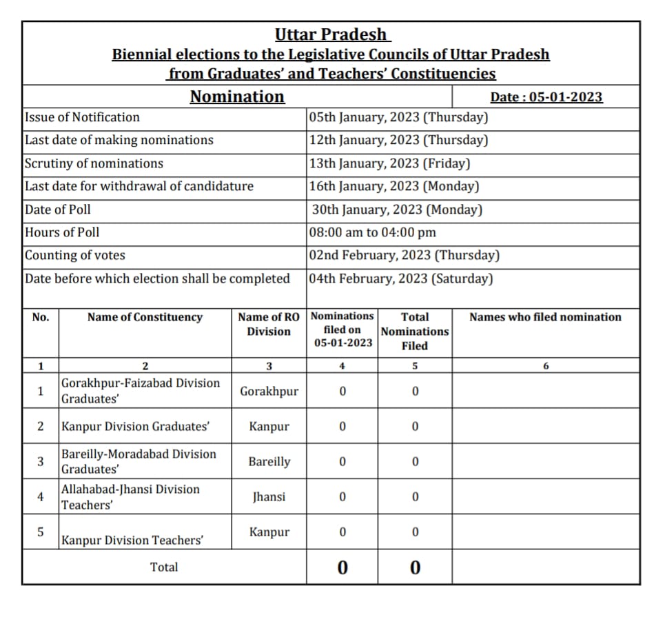 प्रदेश के मुख्य निर्वाचन अधिकारी कार्यालय से मिली जानकारी के अनुसार विधान परिषद के तीन खण्ड स्नातक और दो खण्ड शिक्षक निर्वाचन क्षेत्रों में चुनाव के लिए आज से नामांकन पत्रों के दाखिला का कार्य प्रारम्भ हो गया। इन सीटों के लिए 12 जनवरी तक नामांकन पत्र दाखिल किए जाएंगे। नामांकन पत्रों की जांच 13 जनवरी को होगी और नाम वापसी की अंतिम तिथि 16 जनवरी है। मतदान 30 जनवरी को प्रातः आठ बजे से अपराह्न चार बजे तक होंगे और दो फरवरी को मतों की गणना होगी। इन सीटों से निर्वाचित सदस्यों का कार्यकाल 12 फरवरी, 2023 को समाप्त हो रहा है।