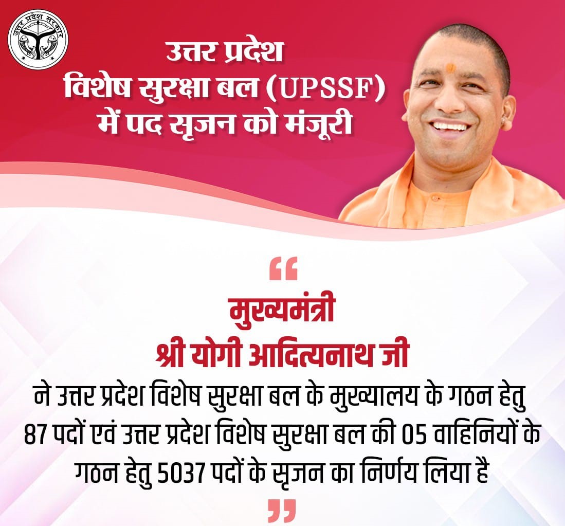 लखनऊ (हि.स.)। मुख्यमंत्री योगी आदित्यनाथ ने मंगलवार को उत्तर प्रदेश में विशेष सुरक्षा बल और विशेष सुरक्षा बल की पांच वाहिनियों के गठन के लिए 5037 पदों के सृजन करने का निर्णय किया है।