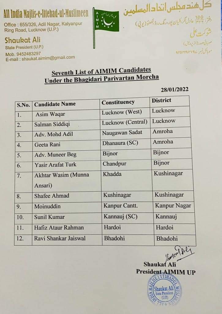 एआईएमआईएम के प्रदेश अध्यक्ष शौकत के मुताबिक, लखनऊ मध्य से सलमान सिद्दीकी, लखनऊ पश्चिम से असीम वकार, अमरोहा की नौगांवा सादात से मोहम्मद आदिल और धनौरा से गीता रानी, बिजनौर की बिजनौर सीट से मुनीर बेग और चांदपुर से यासिर अराफ़ात तुर्क, कुशीनगर की खड्डा से अख्तर वसीम और कुशीनगर से शफी अहमद, कानपुर की कैंट सीट से मोईनुद्दीन, कन्नौज से सुनील कुमार, हरदोई से हाफिज अताउर रहमान और भदोही से रविशंकर जायसवाल को प्रत्याशी बनाया है।