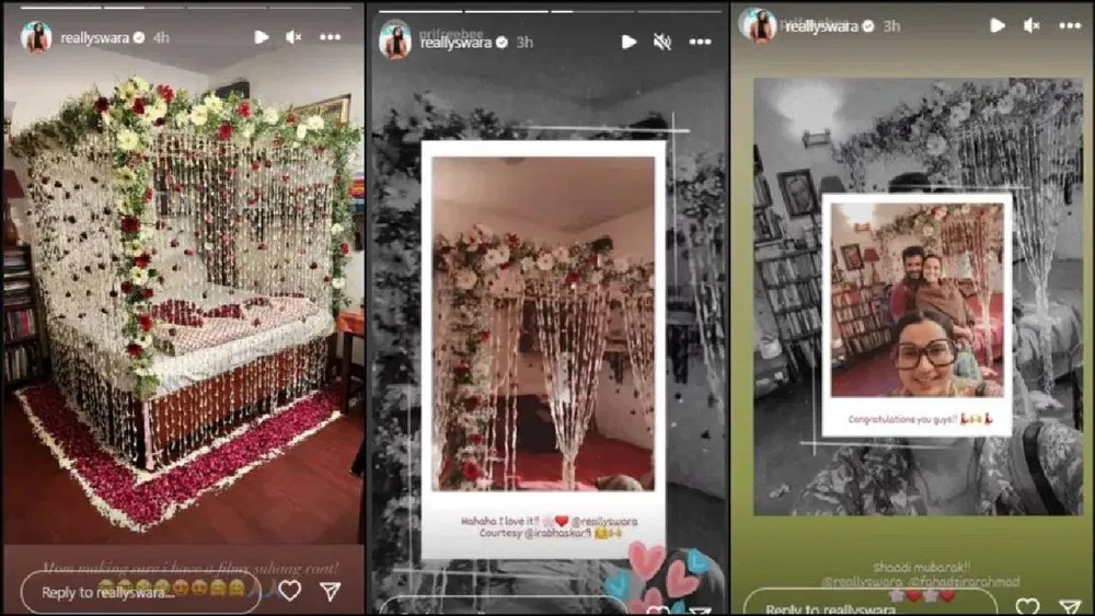 इन तस्वीरों को शेयर करते हुए स्वरा ने कैप्शन में लिखा, “मेरी मां इस बात का पूरा ख्याल रख रही हैं कि मेरा हनीमून फिल्मी हो।’ इसके अलावा उन्होंने इस स्टोरी में एक वीडियो भी शेयर किया है। इस वीडियो में कमरे की एक झलक भी नजर आ रही है। स्वरा फूलों से सजे बेड को दिखाते हुए इसका श्रेय अपनी मां को देती नजर आ रही हैं।