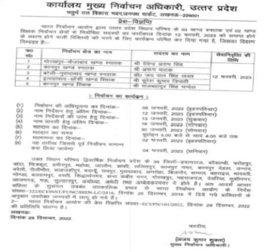 एमएलसी चुनाव के लिए नामांकन सात दिन होगा। 13 जनवरी को नामांकन पत्रों की जांच होगी। 14 को नाम वापस लिया जा सकेगा। 30 जनवरी को मतदान सुबह आठ से शाम चार बजे तक होगा। दो फरवरी को परिणाम आएगा।