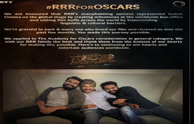 आरआरआर के मेकर्स ने ऑस्कर के लिए इंडिविजुअल कैटेगरीज में एंट्री के लिए अप्लाई किया है। इस बात की जानकारी खुद मेकर्स ने सोशल मीडिया के जरिए दी है। आरआरआर टीम ने सोशल मीडिया पर एक पोस्ट शेयर करते हुए लिखा है कि – हम गर्व महसूस कर रहे हैं कि आरआरआर ने वर्ल्डवाइड सफलता हासिल की है और भारतीय सिनेमा को ग्लोबल स्टेज तक पहुंचाया है। हमने ऑस्कर के लिए जनरल कैटेगरी में अप्लाई किया है।