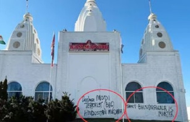 ओटावा(हि.स.)। कनाडा के मिसिसॉगा स्थित राम मंदिर पर हमलाकर मंदिर को विरूपित किया गया है। हमलावरों ने मंदिर की दीवारों पर भारत विरोधी नारे भी लिखे हैं।