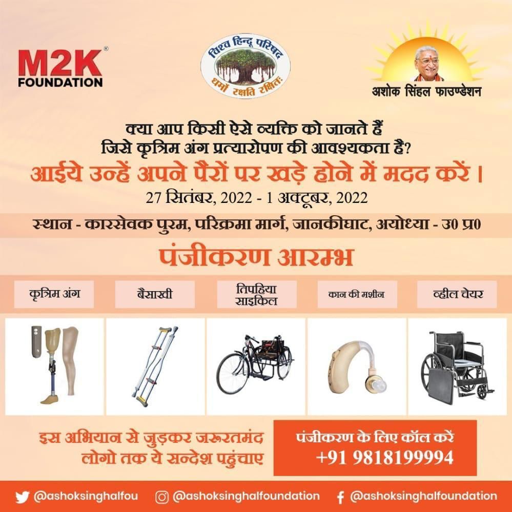 यह जानकारी श्री राम जन्मभूमि तीर्थ क्षेत्र ट्रस्ट के महामंत्री, विहिप उपाध्यक्ष एवं अशोक सिंघल फाउंडेशन दिल्ली ट्रस्टी चम्पत राय ने मंगलवार को दी। उन्होंने बताया कि शिविर अशोक सिंघल फाउंडेशन दिल्ली, भगवान महावीर विकलांग सहायता समिति जयपुर, एमटूके दिल्ली तथा विश्व हिंदू परिषद के संयुक्त प्रयत्नों से किया जा रहा है।