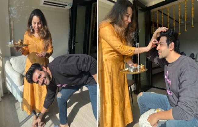 पूरे देश में आज भाई -बहन का त्योहार भाई दूज मनाया जा रहा है। इस खास त्योहार का जश्न बॉलीवुड में भी मनाया जा रहा है। फिल्म अभिनेता कार्तिक आर्यन ने इसकी दो तस्वीरें फैंस के साथ साझा की हैं, जिनमें से एक तस्वीर में उनकी बहन कृतिका उनके माथे पर तिलक लगा रही हैं। वहीं दूसरी तस्वीर में वह अपनी बहन के पैर छूकर आशीर्वाद लेते नजर आ रहे हैं।