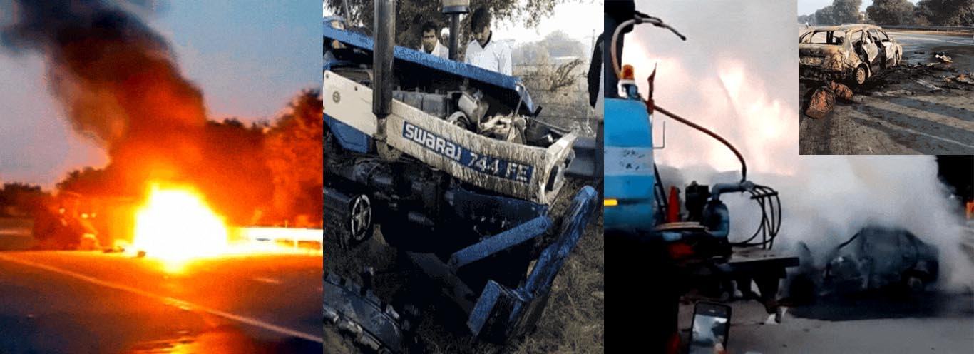 -यमुना एक्सप्रेस-वे पर पलटे ट्रैक्टर से टकराकर कार में लगी आग