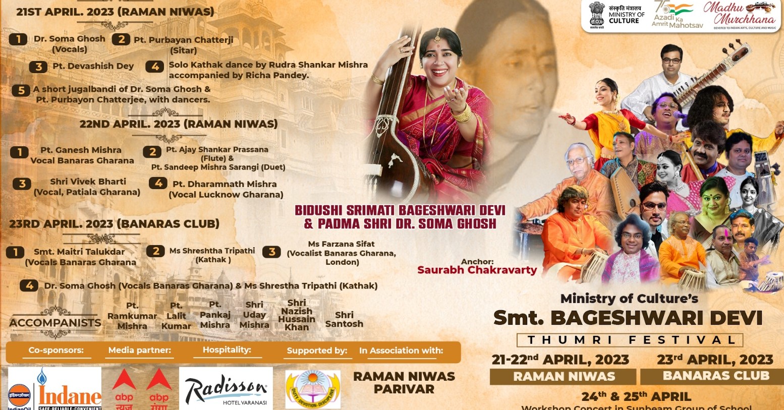 उन्होंने बताया कि भारत सरकार के संस्कृति मंत्रालय के सहयोग से आयोजित हो रहा यह महोत्सव काशी में तीन स्थानों पर होगा। प्रथम दो दिन का आयोजन ठुमरी के तीर्थ स्थल के रुप में प्रसिद्ध महमूरगंज स्थित रमन निवास में होगा। वहीं 23 अप्रैल की प्रस्तुतियां बनारस क्लब में आयोजित होंगी और अंतिम दो दिन यानि 24 और 25 अप्रैल को सनबीम स्कूल में कार्यशाला होगी, जहां नई पीढ़ी के बच्चों को ठुमरी गायन शैली से परिचित कराया जाएगा।