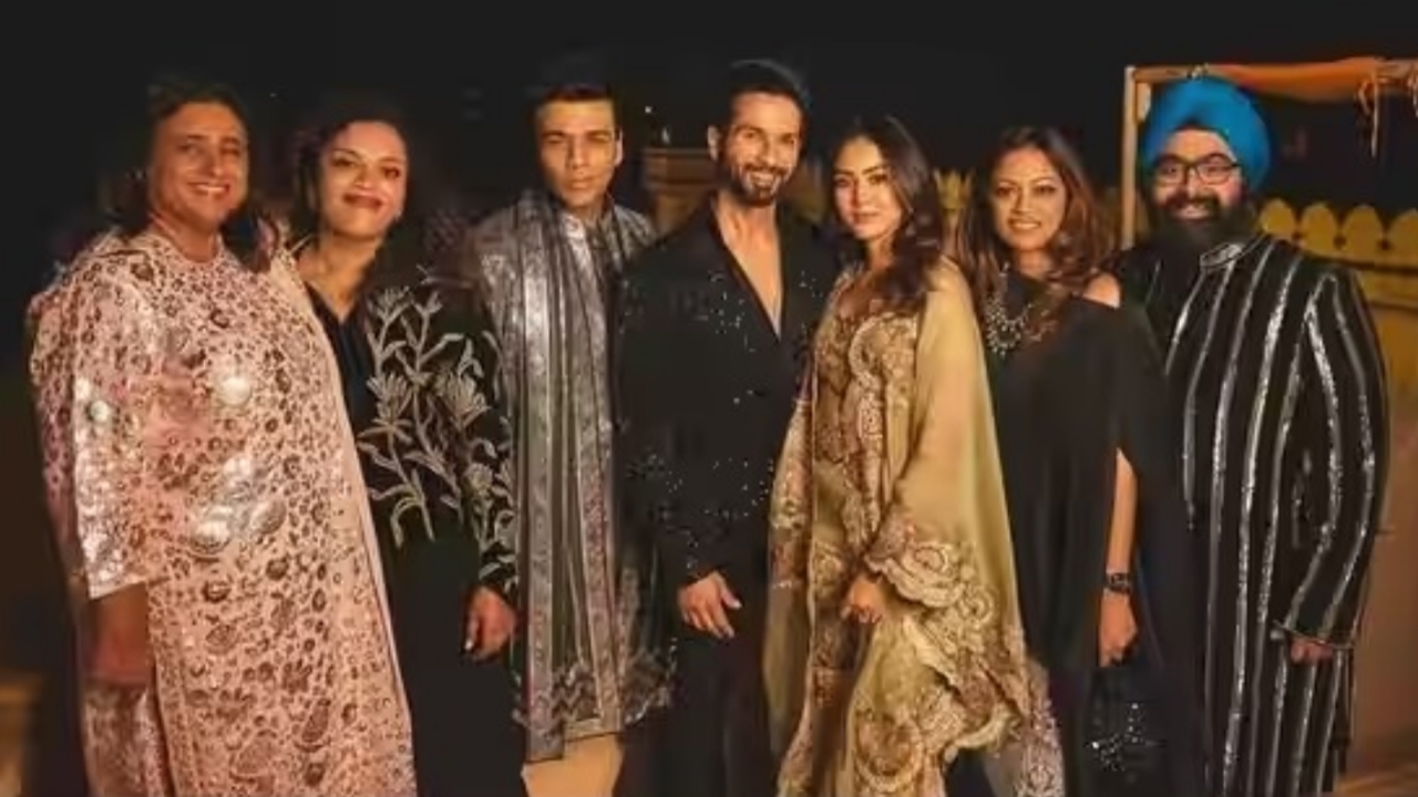 शाहिद ने मैचिंग पैंट के साथ एक चमकदार काला कोट पहना था, जबकि उनकी पत्नी मीरा ने मैचिंग दुपट्टे के साथ फ्लोरल को-ऑर्ड लहंगा पहना था। इस ग्रुप तस्वीर में मीरा और शाहिद करण के साथ बीच में खड़े हैं और अपनी मुस्कुरा रहे हैं। फोटो में अमृतपाल सिंह बिंद्रा, पूजा शेट्टी, शबीना, आरती शेट्टी, तान्या घावरी भी शामिल हैं।