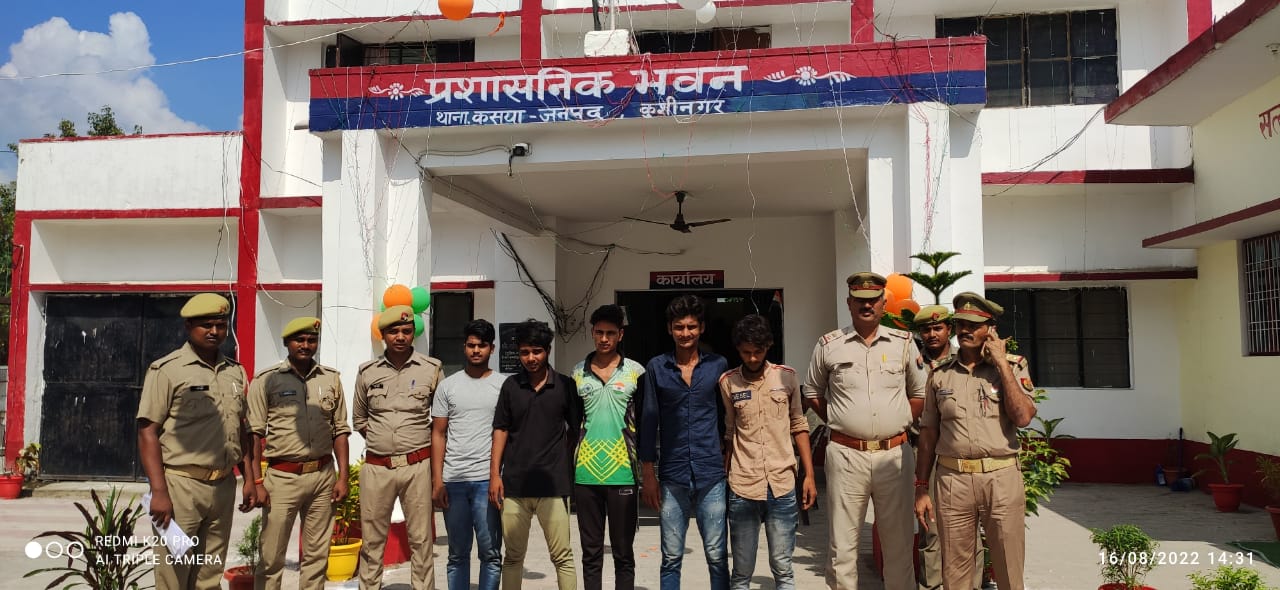 प्रभारी निरीक्षक डा. आशुतोष कुमार तिवारी पुलिस टीम के साथ चेकिंग अभियान में निकले थे। फोरलेन स्थित भैंसहां गांव के सामने क्रासिंग के पास वाहन पर सवार कुछ युवक सड़क किनारे खड़े दिखे। पुलिस टीम को नजदीक आता देख वह भागने लगे लेकिन पुलिस टीम ने उन्हें पकड़ लिया। पकड़े गए आरोपितों की पहचान रामकोला के टेकुआटार मस्जिदिया टोला निवासी कैफ सिद्दीकी उर्फ राजे उर्फ समर शेख, कसया के परेवाटार निवासी सलीम खान, इसी गांव के नसीब आलम, देवरिया जिला के महुंआडीह के गांव भटनी बुजुर्ग निवासी अकरम उर्फ गोलू एवं इसी गांव के निवासी कैफ के रूप में हुई। तलाशी में इनके पास से कई हजार रुपये बरामद हुए। पुलिस ने कड़ाई से पूछताछ की तो उन्होंने स्वीकार किया कि फोरलेन अथवा विभिन्न व्यस्त मार्गों पर व्यापारियों अथवा अन्य राहगीरों को रोक कर भय बनाकर वह रंगदारी वसूल करने का कार्य करते हैं। प्रभारी निरीक्षक डा. तिवारी ने बताया कि सभी आरोपित शातिर अपराधी हैं। इनका मुख्य कार्य मार्ग पर राहजनी और रंगदारी वसूलना है। इनके नेटवर्क को खंगाला जा रहा है।