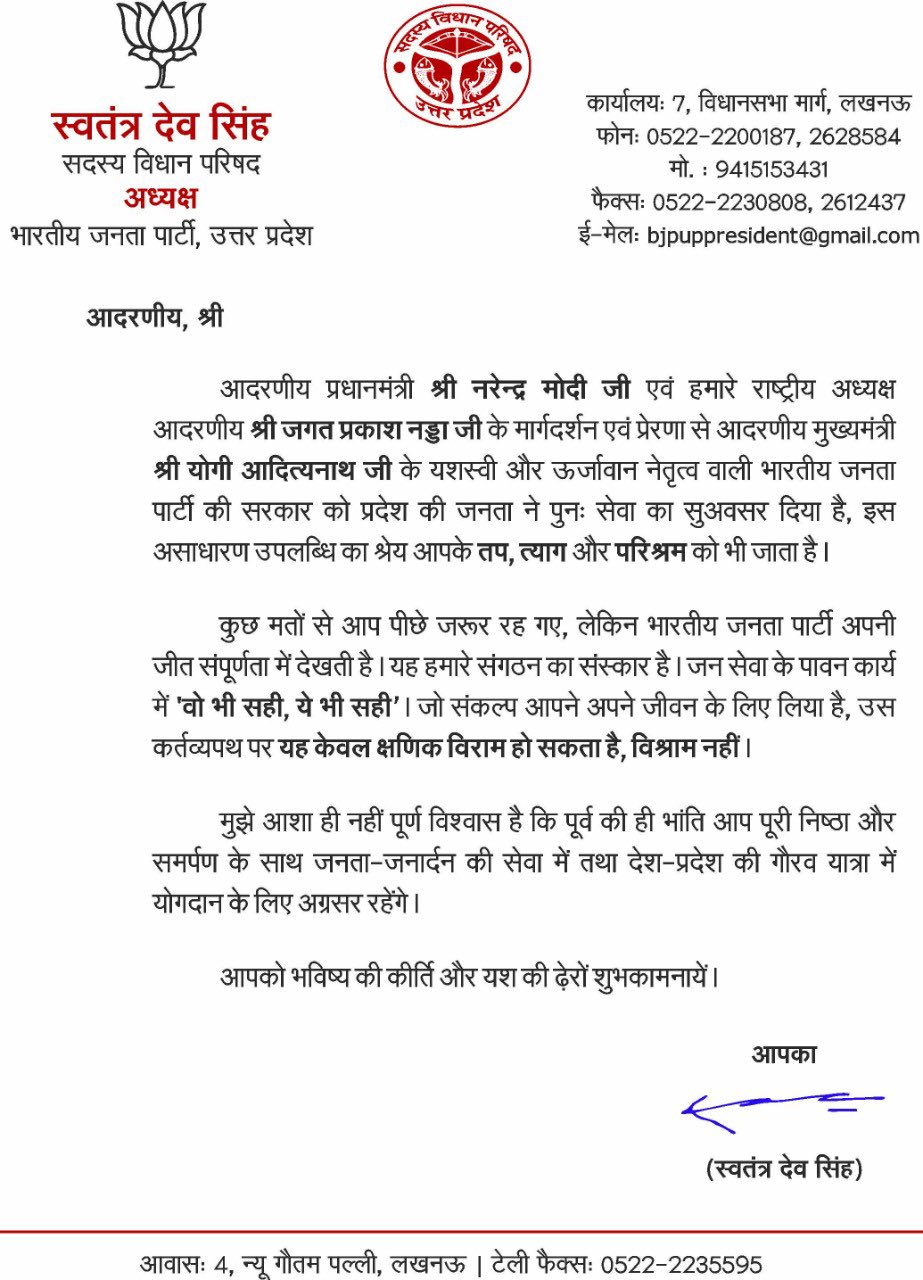 स्वतंत्र देव सिंह ने पत्र में लिखा है कि प्रधानमंत्री नरेंद्र मोदी, राष्ट्रीय अध्यक्ष जगत प्रकाश नड्डा के मार्गदर्शन एवं प्रेरणा से मुख्यमंत्री योगी आदित्यनाथ के यशस्वी और ऊर्जावान नेतृत्व वाली भारतीय जनता पार्टी की सरकार को प्रदेश की जनता ने पुनः सेवा का अवसर दिया है। इस असाधारण उपलब्धि का श्रेय आपके तप, त्याग और परिश्रम को भी जाता है।