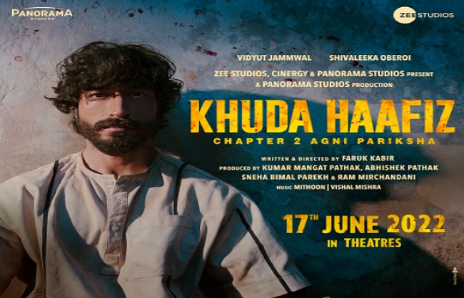 बॉलीवुड में एक्शन हीरो की छवि बना चुके अभिनेता विद्युत् जामवाल और शिवालिका ओबरॉय की आगामी फिल्म खुदा हाफिज 2 की रिलीज डेट मेकर्स ने तय कर दी है।इस बारे में अभिनेता विद्युत जामवाल ने सोशल मीडिया के जरिए जानकारी दी। अपने आधिकारिक इंस्टाग्राम पर फिल्म का एक पोस्टर शेयर करते हुए एक्टर ने फिल्म की तारीख का एलान किया। इस पोस्टर को शेयर करते हुए एक्टर ने लिखा, खुदा हाफिज चैप्टर 2 में समीर और नरगिस की अग्निपरीक्षा के साक्षी बनें। फिल्म 17 जून, 2022 को सिनेमाघरों में रिलीज होगी।’