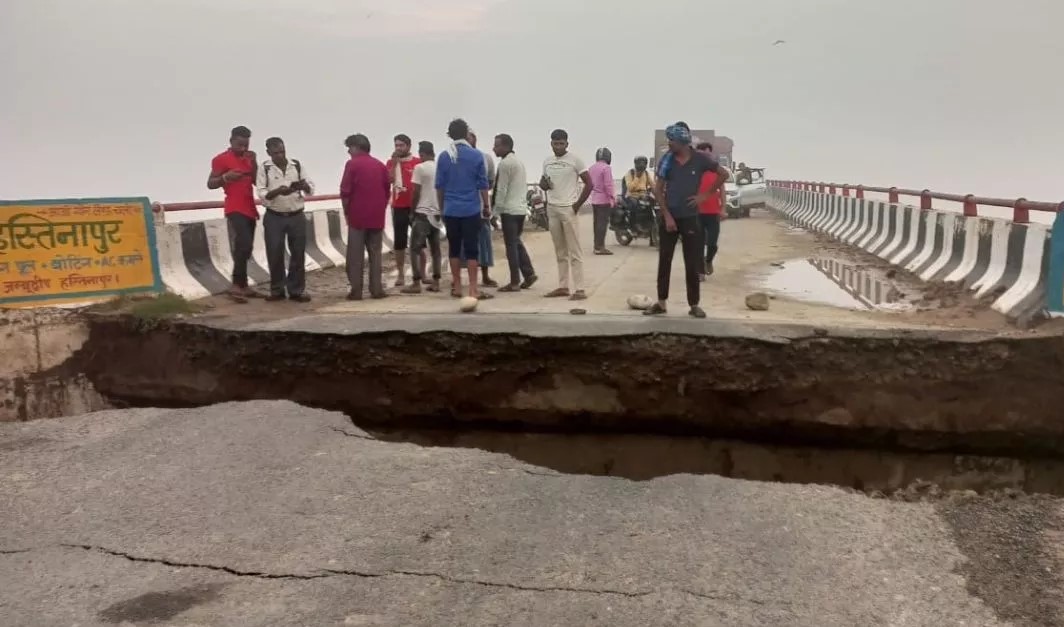 हस्तिनापुर के रास्ते मेरठ जनपद को बिजनौर के चांद को जोड़ने के लिए गंगा नदी पर भीमकुंड गंगा पुल का निर्माण हुआ था। लगभग डेढ़ दशक में बने पुल पर मजबूत एप्रोच रोड नहीं बन पाया। जुलाई 2022 में भी इस पुल का एप्रोच रोड बह गया था। इसके बाद मजबूत एप्रोच रोड बनाने के लिए शासन से बजट भी मांगा गया, लेकिन एक साल बाद भी बजट नहीं मिलने पर मजबूत एप्रोच रोड नहीं बन पाया। ठेकेदार ने किसी तरह से एप्रोच रोड बनाया, लेकिन रविवार को हुई बारिश को यह एप्रोच रोड नहीं झेल पाया। सोमवार सुबह गंगा के तेज बहाव में एप्रोच रोड में बड़ा कटान हो गया। इससे मेरठ के हस्तिनापुर क्षेत्र का बिजनौर के चांदपुर से संपर्क कट गया। एप्रोच रोड के बहने से दोनों जिलों के लोगों का संपर्क टूट गया है। इससे लोग बहुत परेशान हो रहे हैं।