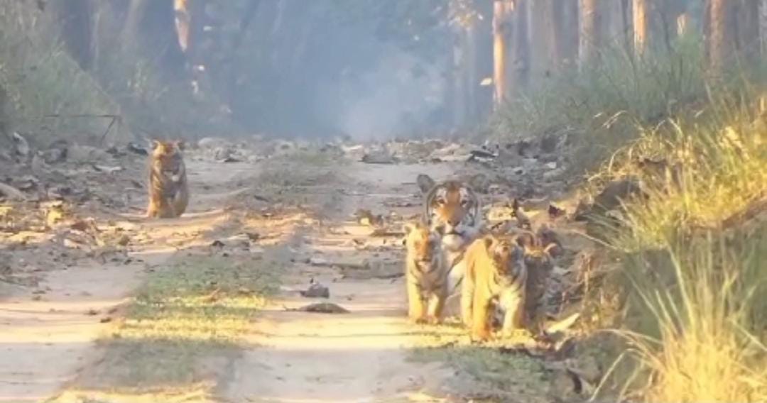 लखीमपुर खीरी (हि.स.)। दुधवा नेशनल पार्क में घूम रहे पर्यटकों की खुशी का उस वक्त ठिकाना नहीं रहा जब उन्हें एक बाघिन अपने चार शावकों के साथ घूमती हुई दिखाई दी। पर्यटकों ने इसका वीडियो बनाया और सोशल मीडिया पर वायरल कर दिया, जिसके बाद से पार्क प्रशासन ने शावकों की निगरानी बढ़ा दी है।