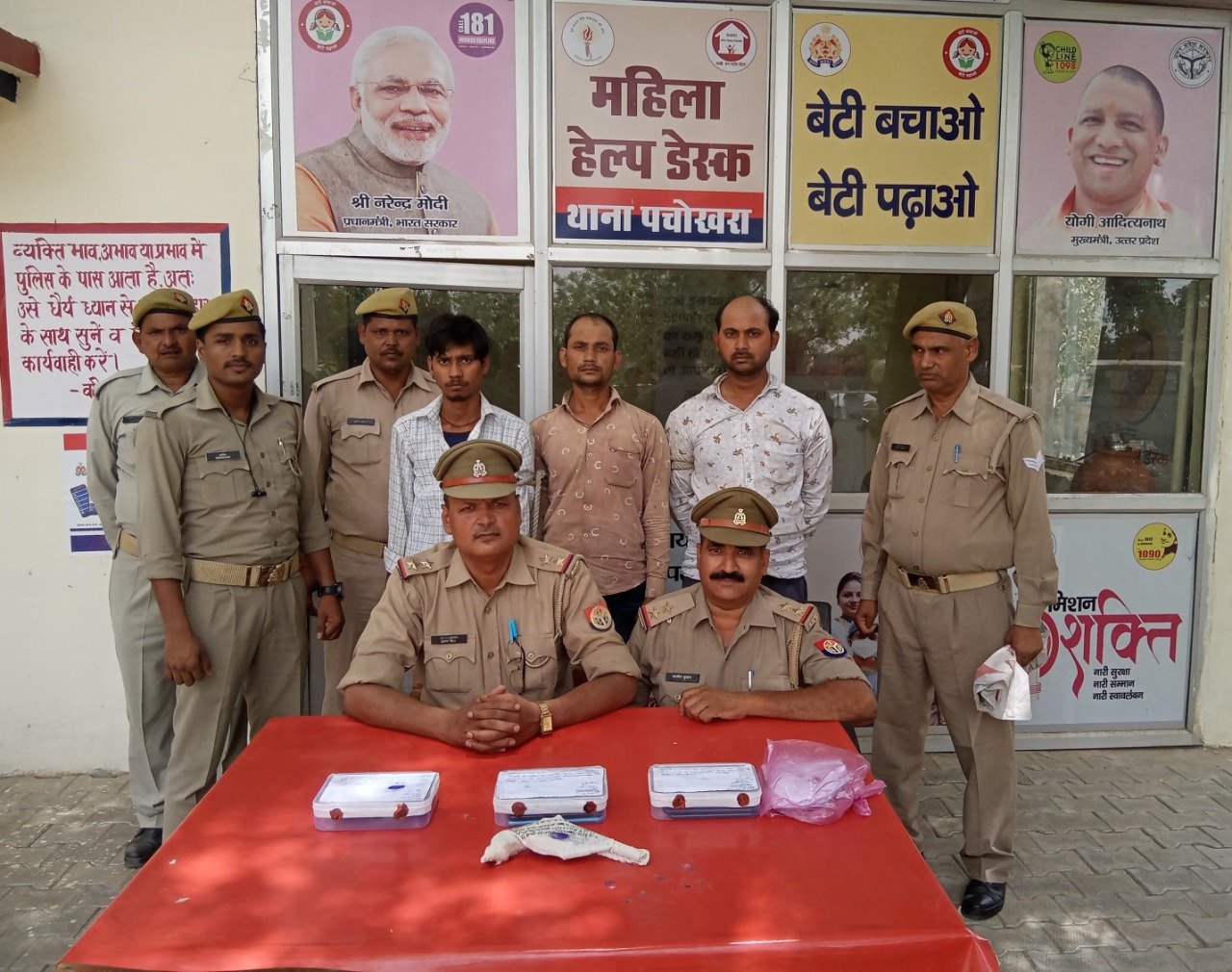 थानाध्यक्ष पचोखरा अन्जीश कुमार पुलिस टीम के साथ मंगलवार की रात्रि क्षेत्र में गस्त पर थे, तभी उन्होंने सूचना पर अभियुक्तगण शिव कुमार पुत्र मुकेश कुमार निवासी ग्राम ओरंगाबाद थाना जसराना, सगे भाई सोनू व सीटू निवासी ग्राम कन्थरी थाना शिकोहाबाद को गिरफ्तार किया है। गिरफ्तार अभियुक्तों के कब्जे से 1 एक तमंचा, कारतूस, चोरी के 9 मोबाइल बरामद हुये है।