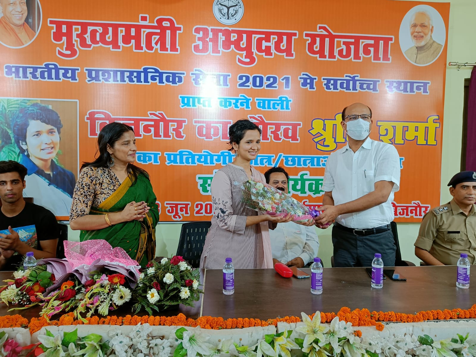 बिजनौर ( हि.सं.) थाना कोतवाली शहर क्षेत्रान्तर्गत मुख्यमंत्री अभ्युदय योजना के अंतर्गत भारतीय प्रशासनिक सेवा 2021 में सर्वोच्च स्थान प्राप्त कर जनपद बिजनौर को गौरवान्वित करने वाली श्रुति शर्मा द्वारा वर्धमान डिग्री कॉलेज में प्रतियोगिता के छात्र छात्राओं के साथ संवाद किया गया । कार्यक्रम में जनपद बिजनौर के जिलाधिकारी एवं पुलिस अधीक्षक द्वारा बुके देकर श्रुति शर्मा का हौसलाअफजाई की गई । इस दौरान स्कूल स्टाफ एवं स्कूली छात्र – छात्राएं बड़ी संख्या के साथ संवाद में मौजूद रहे । छात्रों ने श्रुति की इस उपलब्धि व सफलता प्राप्त करने से सम्बन्धित कई प्रश्नों को पूछा जिसके जवाब में श्रुति शर्मा ने कड़े परिश्रम, एकाग्रता, पढाई के प्रति समर्पण को महत्वपूर्ण बताया और सभी के उज्ज्वल भविष्य की कामना की। इस मौके पर उनके माता पिता व परिजन भी मौजूद रहे।