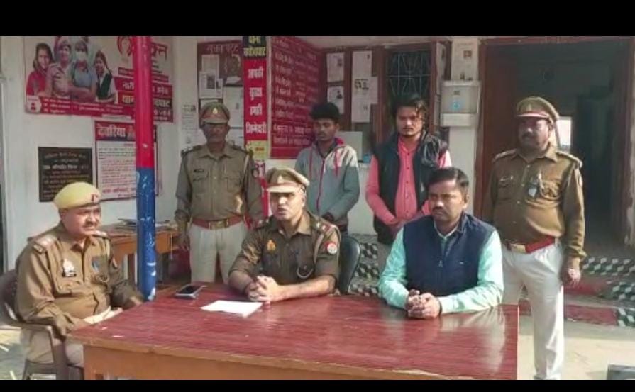 देवरिया ( हि . स . ) । बघौचघाट थाना क्षेत्र में दो युवकों द्वारा गांव के ही एक शीशम के पेड़ पर तेंदुए की फर्जी तस्वीर बना कर वायरल कर दी, जिससे ग्रामीणों में दहशत फैल गई । पुलिस और वन विभाग को सूचना मिली तो पुलिस ने जाँच शुरू की तो पता चला कि दो लड़कों ने फर्जी तस्वीर को शेयर किया है ।पुलिस दोनों युवकों को पकड़ कर थाने ले आई और उनसे पूछताछ कर रही है ।
