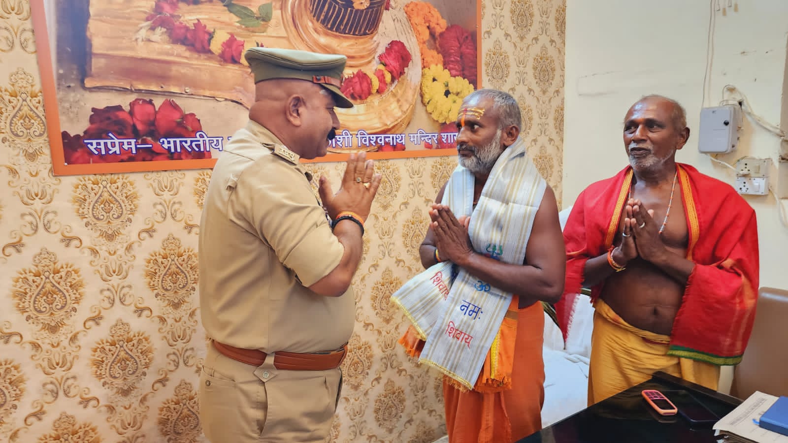 वाराणसी(हि.स.)। तेलंगाना से लगभग 1200 किमी साइकिल चलाकर बाबा विश्वनाथ के दर्शन-पूजन के लिए काशी पहुंचे तीन श्रद्धालुओं का भक्तिभाव देख कर लोग दंग रह गए। बाबा विश्वनाथ के प्रति श्रद्धालुओं का समर्पण भाव देखकर चौक थाने के प्रभारी निरीक्षक शिवाकांत मिश्र ने गुरुवार को थाने में तीनों को अंगवस्त्र, रुद्राक्ष माला एवं काशी का प्रतीक चिह्न देकर सम्मानित किया और उनको नाश्ता भी कराया।
