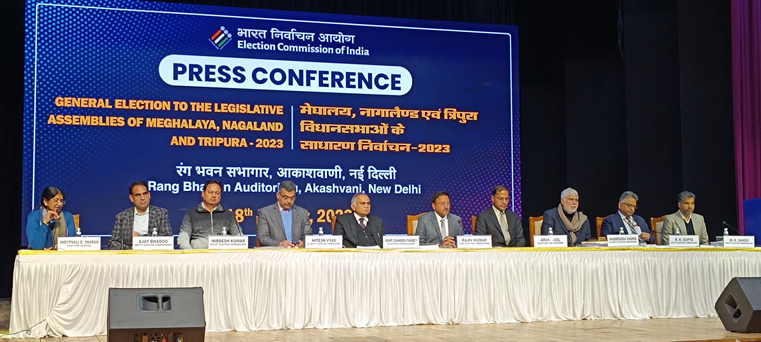 मुख्य चुनाव आयुक्त राजीव कुमार ने चुनाव आयुक्त अनूप चंद्र पांडे और अरुण गोयल के साथ नई दिल्ली स्थित आकाशवाणी के रंग भवन ऑडिटोरियम में पत्रकार वार्ता के दौरान नागालैंड, मेघालय और त्रिपुरा विधानसभाओं के चुनाव कार्यक्रम की घोषणा की।