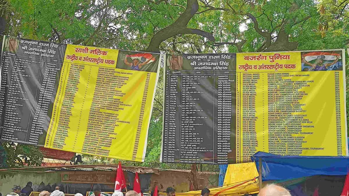 जंतर-मंतर पर लगे तीन पोस्टरों में से एक पर विनेश फोगाट और बृजभूषण शरण सिंह का नाम है तो दूसरे पोस्टर में बजरंग पूनिया और बृजभूषण शरण सिंह का नाम लिखा हुआ है। वहीं तीसरे पोस्टर में साक्षी मलिक और बृजभूषण शरण सिंह का नाम है। पोस्टर के द्वारा यह तुलना की गई है कि एक तरफ बृजभूषण के आपराधिक रिकॉर्ड है और दूसरी तरफ देश के लिए पदक जीतने वाले पहलवानों के रिकॉर्ड हैं।