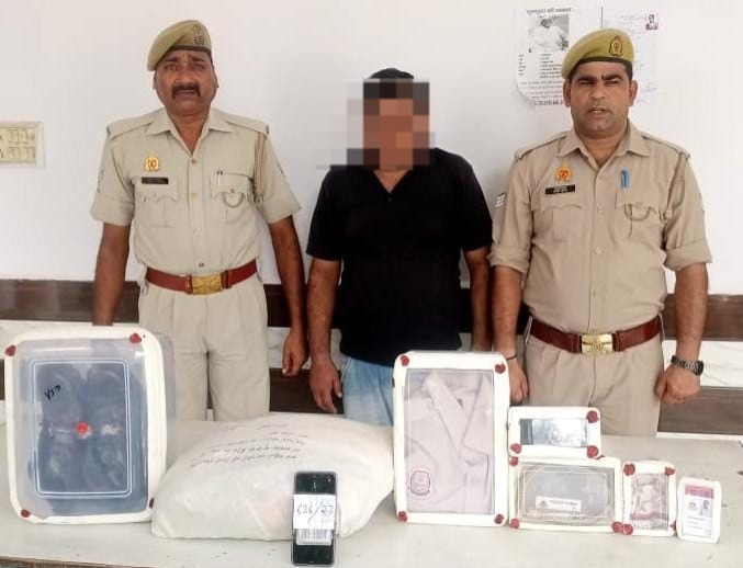 गाजियाबाद (हि.स.)। पुलिस की क्राइम ब्रांच ने गुरुवार को दिल्ली पुलिस के एक फर्जी सब इंस्पेक्टर को गिरफ्तार किया। वह दिल्ली पुलिस की वर्दी धारण कर फर्जी सब इंस्पेक्टर बनकर पुलिस का रौब दिखाकर विवादित भूमि पर कब्जा कराने, कब्जा छुड़ाने एवं अन्य विवादित मामलों को धमकाकर निपटाने और अवैध रूप से धन उगाही करने का काम करता था। उसके पास से सब इंस्पेक्टर का फर्जी परिचय पत्र, सफेद धातु के स्टार, दिल्ली पुलिस के शोल्डर बैज सफेद धातु और दिल्ली पुलिस की एक बेल्ट बरामद की।