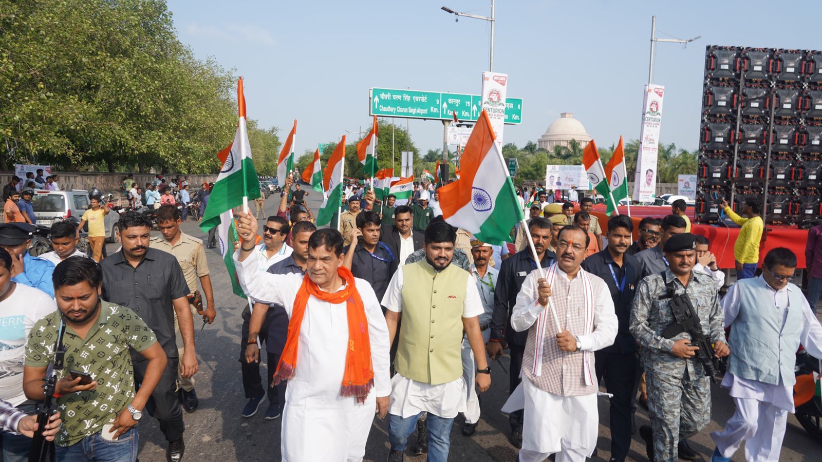लखनऊ (हि.स.)। “भारत माता की जय”, “देश की शान है तिरंगा”, आदि नारों के साथ शनिवार सुबह का वातावरण देशभक्ति से ओत-प्रोत हो गया। हजारों की संख्या में युवा, बुजुर्ग दो किलोमीटर लंबे झंडे को लेकर चल रहे थे। इस अवसर पर उप मुख्यमंत्री केशव प्रसाद मौर्य और कैबिनेट मंत्री एके शर्मा अतिथि के रूप में लोगों का उत्साहवर्धन करते रहे।
