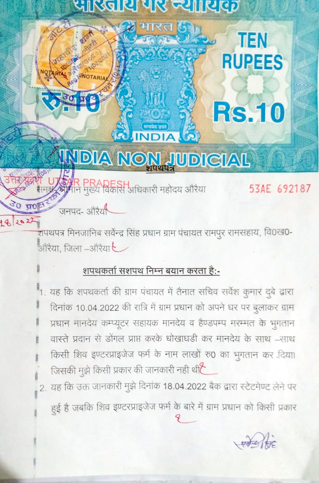 औरैया विकास खंड के ग्राम जैतपुर, जमालीपुर, उद्यमपुर और प्रयागपुर के पंचायत सचिव सर्वेश दुबे ने जिला पंचायत राज अधिकारी, औरैया से 11 अप्रैल 2022 से 10 दिन का अवकाश लिया था। अवकाश पर जाने के बाद पंचायत सचिव सर्वेश दुबे ने उक्त ग्राम पंचायतों का डोंगल उपयोग करते हुए पंचायतों के खातों से लाखों रुपया निकाल लिया। खास बात यह है कि जिन फर्मों के नाम सचिव ने भुगतान किया है उन्हें कोई भी ग्राम प्रधान जानता तक नहीं है। ग्राम पंचायतों का डोंगल ग्राम प्रधानों के पास रहता है।