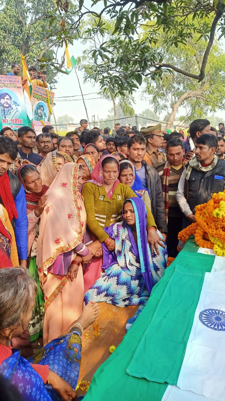 वाराणसी(हि.स.)। जम्मू कश्मीर के पठानकोट में तैनात सेना के जवान श्यामजी यादव का पार्थिव शरीर बुधवार को पैतृक आवास सरवनपुर लाया गया। जवान के पार्थिव शरीर को तिरंगे में लिपटा देख परिजन बिलख पड़े। जवान की पत्नी इंदो देवी, दोनों बेटे किशन और नितिन, बेटी नेहा का रूदन देख मौके पर मौजूद ग्रामीणों और पड़ोसियों की आंखे भी नम हो गईं। जवान को श्रद्धांजलि देने आसपास के गांव के सैकड़ों लोग भी वहां पहुंचे। इस दौरान जिले के आला अफसरों के न पहुंचने पर लोगों में नाराजगी भी दिखी।