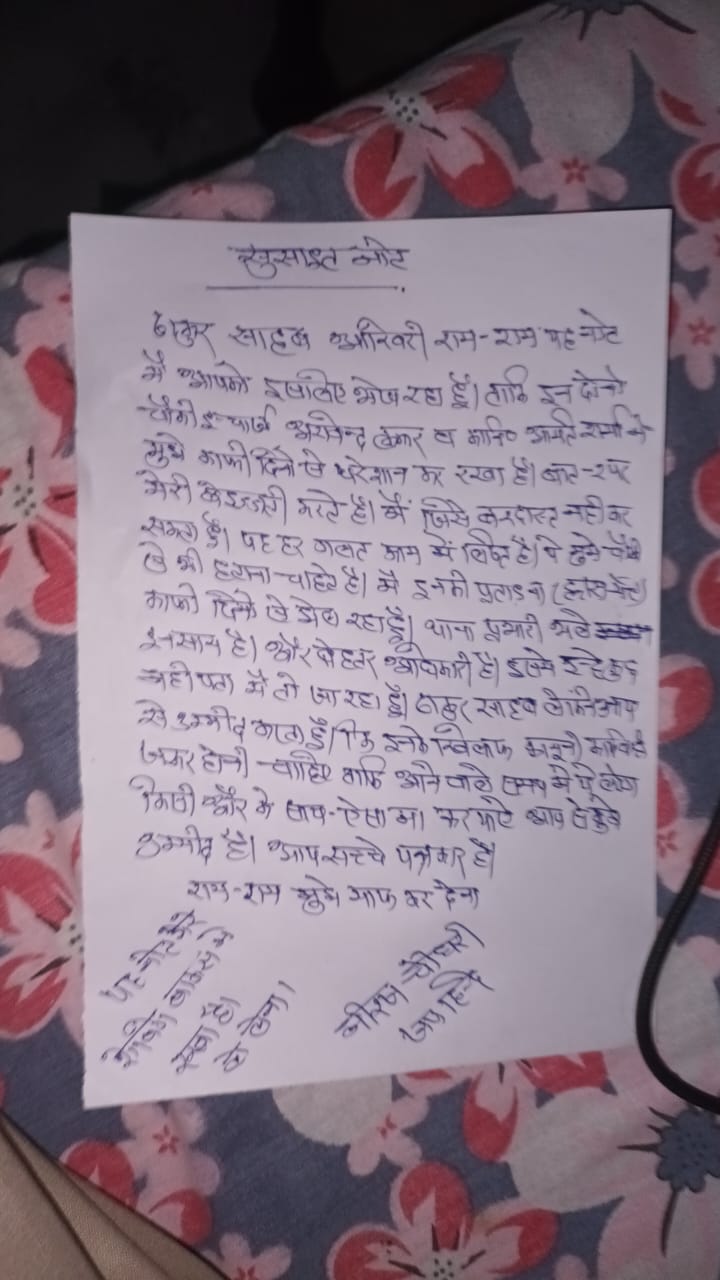 एसएसपी सुशील घुले ने बताया कि बीती रात करीब डेढ़ बजे हेड कांस्टेबल नीरज चौधरी ने सरकारी रायफल से खुद को गोली मार ली। उन्हें गंभीर हालत में अस्पताल में भर्ती कराया गया है। हेड कांस्टेबल ने एक सुसाइड नोट लिखकर व्हाट्सएप पर वायरल कर दिया है। इसमें लिखा है कि “ठाकुर साहब राम-राम यह नोट मैं आपको इसलिए भोज रहा हूँ। ताकि इन दोनों -चौकी इंचार्ज अरविंद कुमार और कांस्टेबल अमित शर्मा ने मुझे काफी दिनों से परेशान कर रखा है। बार-बार मेरी बेइज्जती करते हैं। मैं इसे बर्दास्त नहीं कर सकता। यह हर गलत काम में लिप्त हैं। ये मुझे चौकी से हटाना चाहते हैं। मैं इनकी प्रताड़ना से काफी परेशान हूं।”