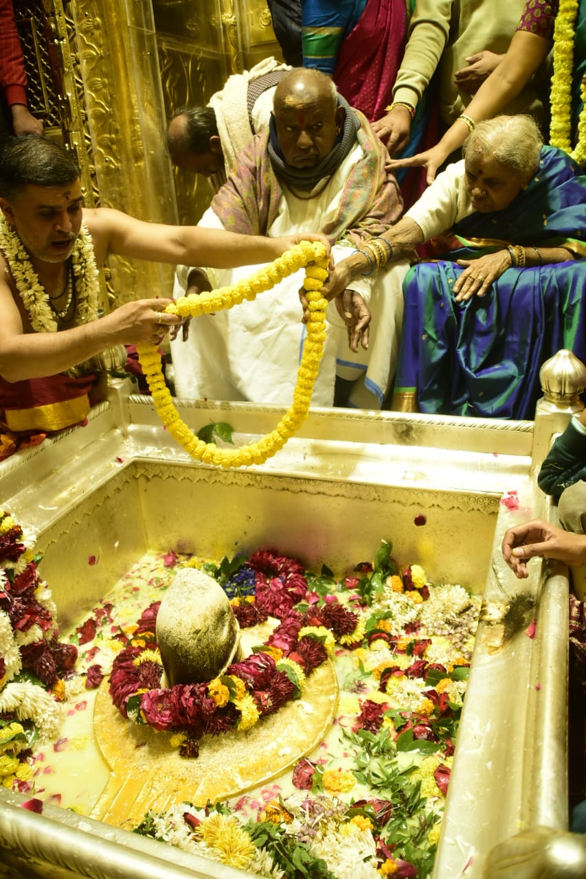 इस दौरान उन्होंने बाबा की सप्त ऋषि आरती देखी। आरती के पश्चात उन्होंने बाबा श्री काशी विश्वनाथ का सपरिवार षोडशोपचार पूजन कर परिवार और देश में सुख शान्ति की कामना की। पूर्व प्रधानमंत्री श्री काशी विश्वनाथ का पूजन अर्चन करने के पश्चात माता विशालाक्षी के दरबार भी गए, जहां उन्होंने मां से आशीर्वाद प्राप्त किया। मंदिर के अपर मुख्य कार्यपालक अधिकारी निखिलेश कुमार मिश्रा ने पूर्व प्रधानमंत्री सहित परिवार के सभी सदस्यों को अंग वस्त्र, रुद्राक्ष की माला और प्रसाद भेंट किया।