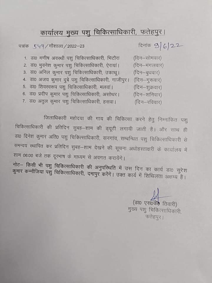 जारी आदेश-पत्र में जिले के डॉ. मनीष अवस्थी पशु चिकित्सा अधिकारी भिटौरा, डॉ. भुवनेश कुमार पशु चिकित्सा अधिकारी ऐरायां, डॉ. अनिल कुमार पशु चिकित्सा अधिकारी उकाथू, डॉ. अजय कुमार दुबे पशु चिकित्सा अधिकारी गाज़ीपुर, डॉ. शिव स्वरूप पशु चिकित्सा अधिकारी मलवां, डॉ. प्रदीप कुमार पशु चिकित्सा अधिकारी असोथर, डॉ. अतुल कुमार पशु चिकित्सा अधिकारी हसवा को पत्र जारी कर देखभाल करने के लिए निर्देशित किया गया था।