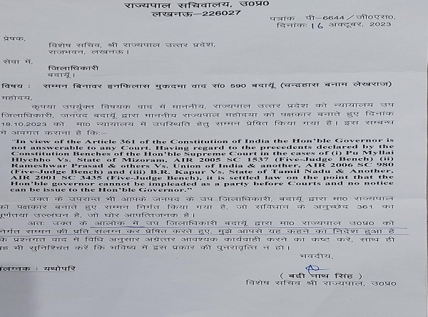 थाना सिविल लाइन के बहेड़ी के रहने वाले चंद्रहास नाम के एक व्यक्ति ने जनपद की सदर तहसील के एसडीएम न्यायिक कोर्ट में जमीन से संबंधित एक वाद दायर किया था। कोर्ट में दायर में वाद में कहा गया कि उनकी बुआ कटोरी देवी की जमीन को उनके कुछ रिश्तेदारों ने अपने नाम कर लेखराज नाम के व्यक्ति को बेच दी थी। शासन द्वारा लेखराज से कुछ जमीन को अधिग्रहण किया गया था, जिसके बदले लेखराज को 12 लाख का मुआवजा भी दिया गया था। इसके बाद चंद्रहास ने बदायूं की सदर तहसील के एसडीएम न्यायिक कोर्ट में वाद दायर किया। इसमें राज्यपाल, पीडब्ल्यूडी और लेखराज को पार्टी बनाया गया था। इस मामले में 10 अक्टूबर को सदर तहसील के एसडीएम न्यायिक कोर्ट से राज्यपाल को नोटिस जारी हुआ था।18 अक्टूबर को उन्हें अपना पक्ष रखने की बात कही गई। नोटिस मिलने के बाद राज्यपाल के विशेष सचिव बद्रीनाथ सिंह ने 16 अक्टूबर को आपत्ति जताते हुए पत्र में लिखा कि राज्यपाल को नोटिस भेजना संविधान के अनुच्छेद 361 का उल्लंघन है और आपत्तिजनक है। साथ ही पत्र में यह कहा भी कहा गया है कि डीएम को निर्देश दिए गए हैं कि भविष्य में इस तरह की पुनरावृत्ति न हो।