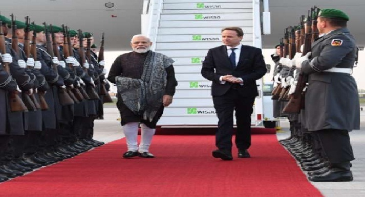 बर्लिन। तीन दिवसीय यूरोप दौरे पर गए पीएम नरेन्द्र मोदी सोमवार सुबह जर्मनी की राजधानी बर्लिन पहुंचे। पीएम मोदी जर्मनी के चांसलर ओलाफ स्काल्ज से मुलाकात करेंगे। इसके अलावा वह कई बिजनेस लीडर्स से भी मिलेंगे। पीएम का यहां एक संबोधन का भी कार्यक्रम है। बर्लिन पहुंचने पर पीएम ने एक ट्वीट किया है। उन्होंने ट्वीट में अपने कार्यक्रम की जानकारी दी है। मोदी ने ट्वीट में कहा, ’मुझे विश्वास है कि इस यात्रा से भारत और जर्मनी के बीच दोस्ती मजबूत होगी।’ पीएम मोदी ने बर्लिन में भारतीय समुदाय के लोगों से मुलाकात की। मोदी होटल एडलान केम्पिंस्की पहुंचे। इस दौरान भारतीय समुदाय के लोगों ने उनका गर्मजोशी से स्वागत किया। इस दौरान ’भारत माता की जय’ के नारे भी लगाए गए।