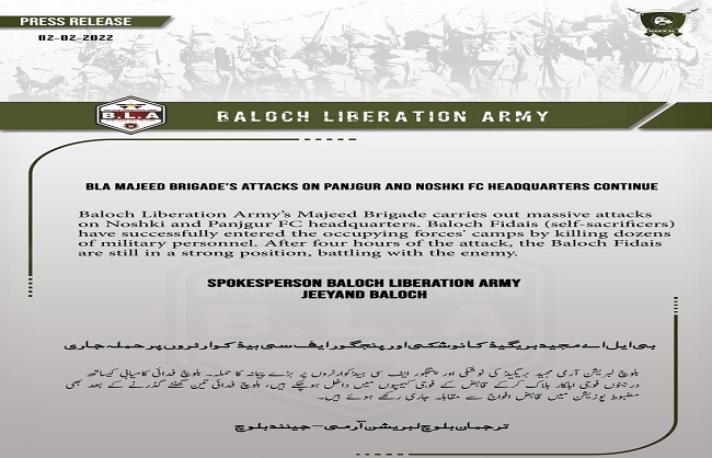 बलूच लिबरेशन आर्मी (बीएलओ) ने प्रेस विज्ञप्ति जारी कर दावा किया कि बीएलए की मजीद ब्रिगेड ने बलूचिस्तान प्रांत में पांजगुर और नूशकी इलाके में फ्रंटियर कोर और सेना के एक ठिकाने पर भीषण हमला किया है। बलूच लड़ाकों का दावा है कि बलूच फिदायीन दस्ते (आत्मघाती लड़ाकों) ने सफलतापूर्वक सेना के ठिकानों में प्रवेश कर इस हमले को अंजाम दिया है। दावा किया गया है कि हमले में 100 पाकिस्तानी सैनिक मारे गए हैं। बीएलए की विज्ञप्ति में कहा गया है कि हमले के चार घंटे बाद भी बलूच लड़ाके सफलता के साथ पाकिस्तानी सेना का सामना कर रहे हैं।