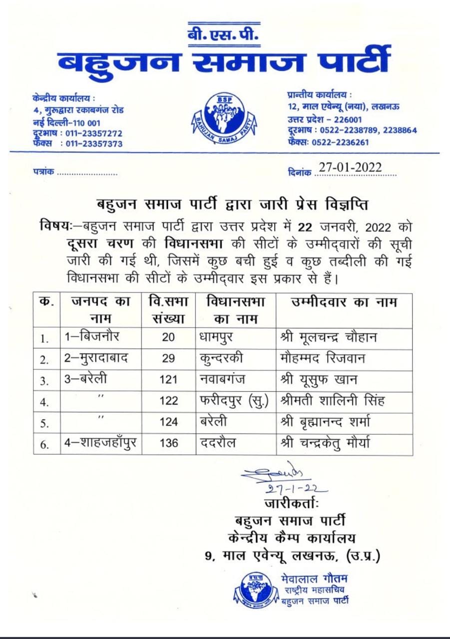 बसपा महासचिव मेवालाल ने सूची जारी करते हुए बिजनौर जिले की धामपुर विधानसभा क्षेत्र के लिए मूलचंद चौहान, मुरादाबाद जिले के कुंदरकी क्षेत्र के लिए मोहम्मद रिजवान, बरेली जिले के नवाबगंज सीट से युसूफ खान, फरीदपुर सीट से शालिनी सिंह, बरेली जिले की बरेली सीट के लिए वृह्नानन्द शर्मा और शाहजहांपुर जिले के ददरौल सीट से चंद्रकेतु मौर्या को उम्मीदवार बनाया गया है।