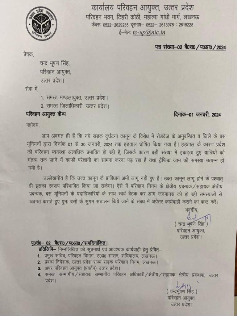 लखनऊ(हि.स.)। उत्तर प्रदेश में एक जनवरी से 30 जनवरी तक विभिन्न बस यूनियनों की हड़ताल है। इस हड़ताल के कारण यात्री असुविधाओं को देखते हुए परिवहन आयुक्त चन्द्रभूषण सिंह ने प्रदेश के जिलाधिकारियों को पत्र लिखा है।