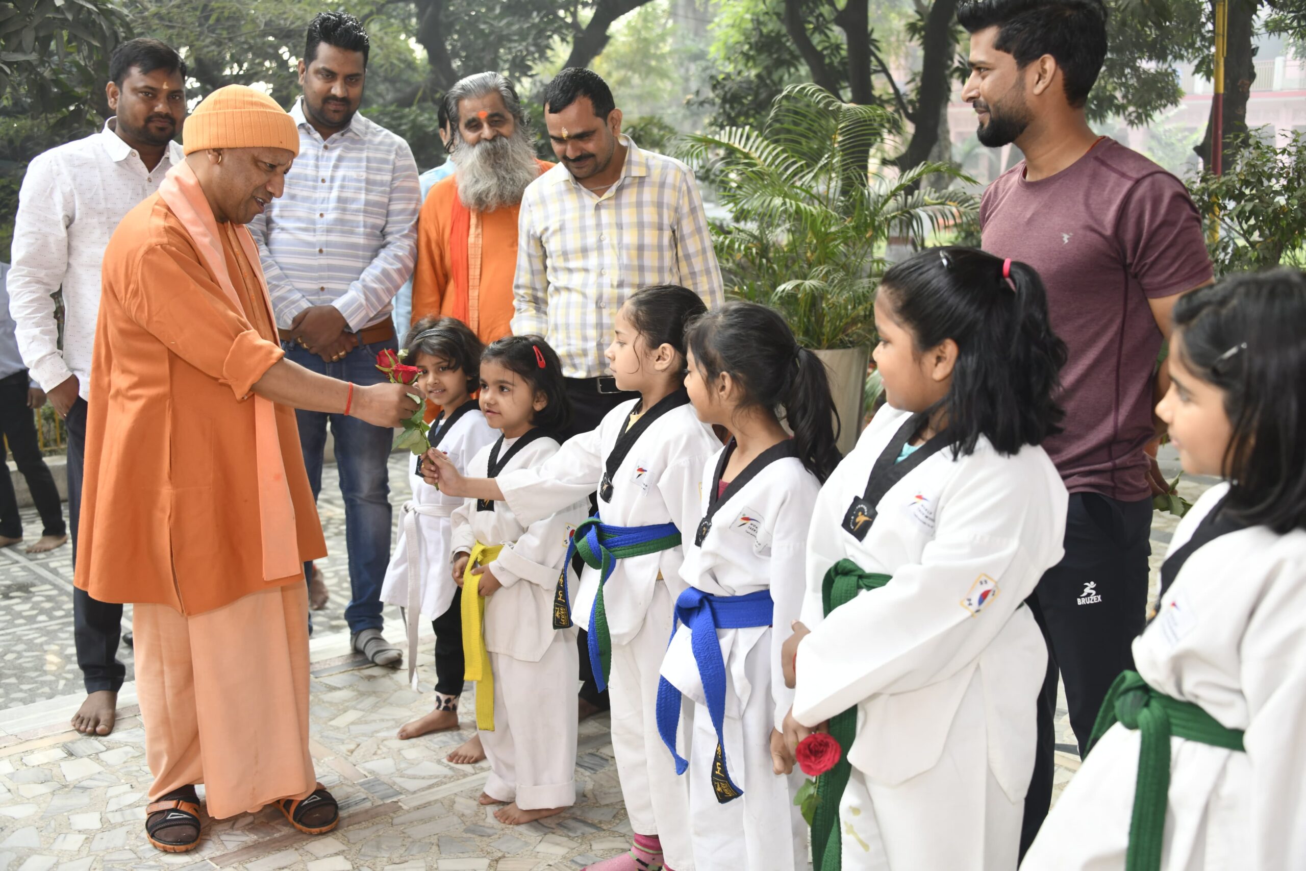 मुख्यमंत्री योगी आदित्यनाथ के गोरखनाथ मंदिर प्रवास के दौरान मंगलवार सुबह दिग्विजयनाथ ताइक्वांडो ट्रेनिंग सेंटर के बच्चे उनसे मिलने पहुंचे। मुख्यमंत्री ने सभी बच्चों को बाल दिवस की शुभकामनाएं दीं। इस अवसर पर बच्चों ने एक-एक कर मुख्यमंत्री योगी को गुलाब का फूल भेंट किया। इस पर मुख्यमंत्री मुस्कुरा उठे। उन्होंने बच्चों से उनके ताइक्वांडो प्रशिक्षण और पढ़ाई को लेकर बातचीत की और खूब सफलता प्राप्त करने का आशीर्वाद देकर विदा किया। मुख्यमंत्री ने बच्चों का उत्साह बढ़ाने के लिए उनके साथ फोटो भी खिंचवाई।