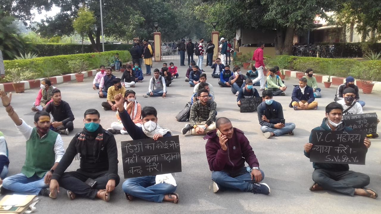 धरने में कोरोना प्रोटोकाल का पालन कर छात्रों ने कहा कि विवि की डिग्री में शास्त्री आचार्य के साथ ग्रेजुएट और पोस्ट ग्रेजुएट न उल्लेखित होने के कारण उन्हें अब जगह-जगह कठिनाइयों का सामना करना पड़ता है। प्रतियोगी परीक्षा क्वालीफाई होने के बाद भी उन्हें नियुक्ति पत्र नहीं मिल रहा। झारखंड में 12 से 15 छात्रों को यह समस्या झेलनी पड़ी है। वर्तमान में भारतीय सेना के भर्ती में धर्म शिक्षक के पद पर छात्र दौड़ व मेडिकल पास कर रहे हैं। लेकिन उन्हें लिखित परीक्षा देने से रोका जा रहा है। छात्रों ने बताया कि दो दिन पूर्व संकाय विभाग के सामने धरना प्रदर्शन किया था। तब संकाय प्रमुख ने आकर आश्वासन दिया था कि इस बारे में कुलपति को पत्र लिखेंगे।