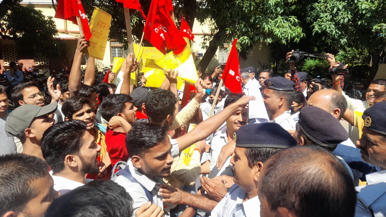 भगत सिंह छात्र मोर्चा से जुड़े छात्रों और कार्यकर्ताओं ने शुक्रवार को फीस वृद्धि के विरोध में विश्वविद्यालय परिसर स्थित केन्द्रीय कार्यालय के सामने जमकर धरना प्रदर्शन किया। फीस वृद्धि वापस लेने की मांग कर छात्र कुलपति से मिलने की जिद करते रहे। छात्रों के प्रदर्शन को देख वहां विवि के प्राक्टोरियल बोर्ड के अफसर और सुरक्षा कर्मी भी पहुंच गये। कार्यालय के मुख्य गेट पर प्रदर्शन कर रहे छात्रों को सुरक्षा कर्मियों ने हटाना शुरू किया तो उनसे धक्का-मुक्की भी की गई।
