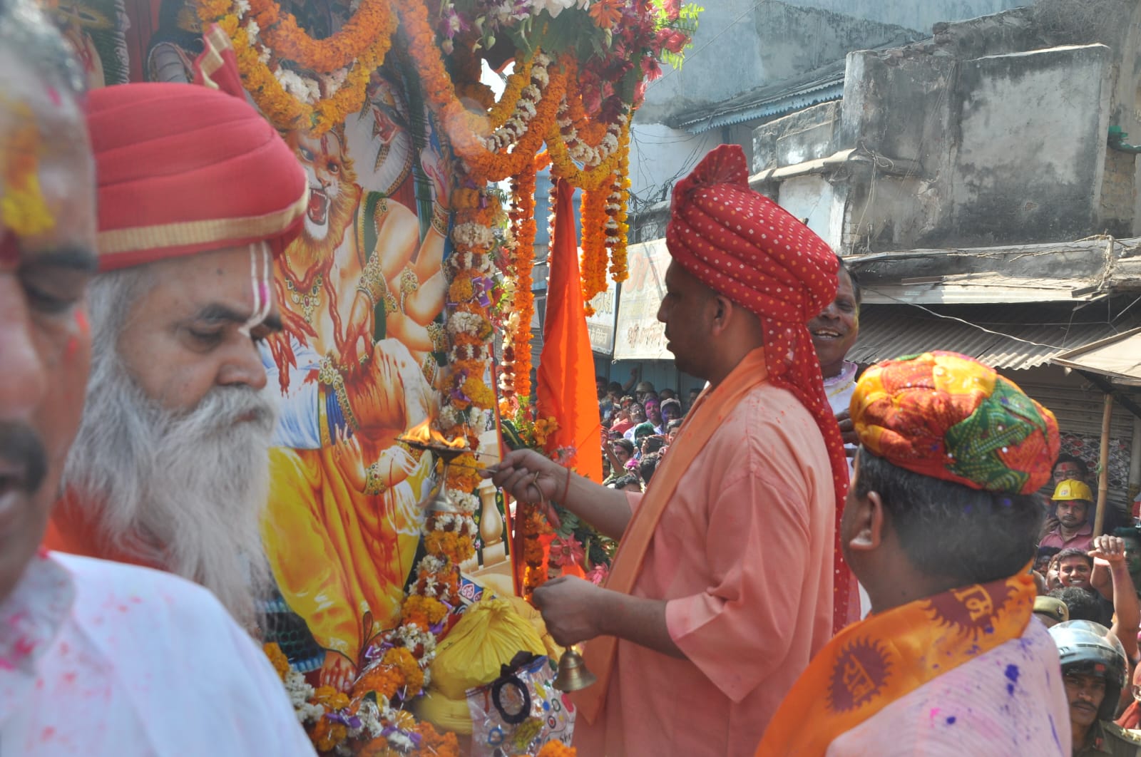 पांच किलोमीटर से अधिक दूरी तय करने वाली शोभायात्रा में पथ नियोजन राष्ट्रीय स्वयंसेवक संघ के कार्यकर्ता करते हैं और भगवान नृसिंह के रथ पर सवार होकर गोरक्षपीठाधीश्वर रंगों में सराबोर हो बिना भेदभाव सबसे शुभकामनाओं का आदान-प्रदान करते हैं।