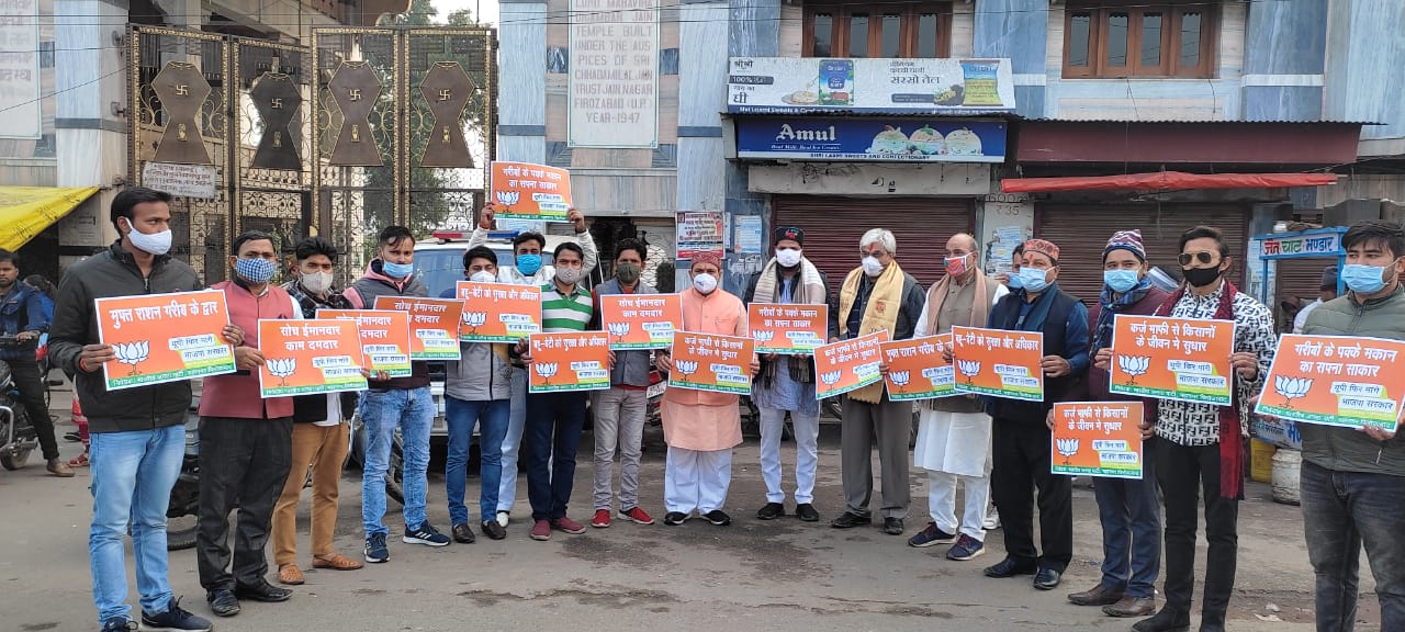 फिरोजाबाद (हि.स.)। राष्ट्रीय नेतृत्व व प्रदेश नेतृत्व के आह्वान पर जनपद की प्रत्येक विधानसभा में कार्यकर्ताओं द्वारा प्रमुख चौराहों पर सरकार की उपलब्धियों के प्ले कार्ड कार्यक्रम का आयोजन किया जाना है। शनिवार को जिलाध्यक्ष भाजयुमो अंकित तिवारी महानगर के नेतृत्व में नगर के प्रमुख जैन मंदिर पर यह कार्यक्रम आयोजित किया गया। कार्यक्रम का शुभारम्भ भाजपा विधायक मनीष असीजा एवं महानगर अध्यक्ष राकेश शंखवार ने किया।